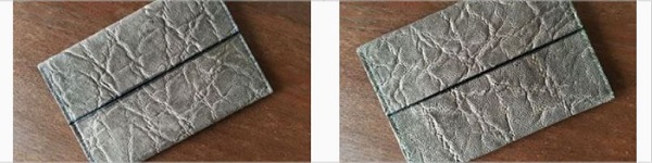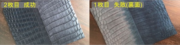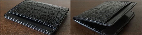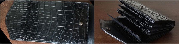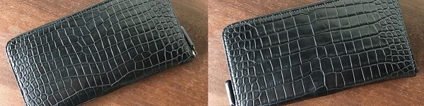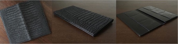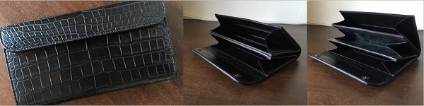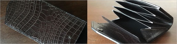 昨年末に取り組んだ新たなアイディアがコチラ。グレーのクロコを身体の片側のみ藍染するというものです。片面をグレーの革、もう片面を黒に近い藍染の革で長財布が欲しいというご要望。最初は異なる革を縫い継ぐことを考えていましたが、耐久性や美しさを考えるとやはり1枚革でやりたいと考えて半分のみ藍染というアイディアに至りました。単純に半分だけ藍染液に浸ければよいという考えでやった1枚目は見事に失敗。かなり慎重にやったものの、毛細管現象でどうしても藍染液が反対側に移ってきてしまい染めの境目もボンヤリとした仕上がりでNG。失敗のショックでしばらく途方に暮れていましたが、気持ちを立て直してなんとか2枚目のグレークロコをゲット。色々と工夫を重ねて綺麗に片面ずつ染め分けることができました。引き続き完成した財布をご紹介させて頂きます。