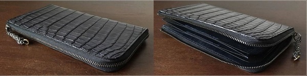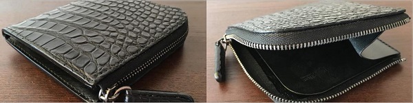 長さは17.5cmと長財布としては非常にコンパクトかつ薄くなっています。Lジップで素早く開き全体を見渡せます。マチのないアコーディオンのような独自構造により閉じたときは薄く、また見たいところを好きな具合で開けるのでストレスのない使い勝手を実現しています。コインケースは浅く舟形にしてあるので見やすく取り出しやすく隅にコインが引っかかることもありません。カード入れは取り出しやすい縦入れで4か所。 詰め込み過ぎるとジップが引っかかったりしますが、容量をキープしてお使いになる方には非常におすすめできます。即納できる在庫は3点あります。クロコ、シェルコードバン#4、超希少革tegu。