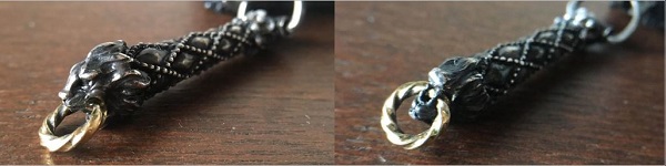 裏面です。蛇は脱皮を繰り返すことから、変化を受け入れ生まれ変わる精神。大地を這って進むことから、忍耐、努力、挑戦してなしとげる。センターはスパイニーオイスターシェルで新しい自分への導きという意味があります。表は肉体、裏は精神をテーマに表裏合わせて人間そのものを表す引き手です。オーダー主はプロレスラーの原学さん(コチラ)。昨年あらたな取り組みとしてR.Motion(コチラ)というジムを始められたので、原さんらしいストーリーを僕なりに考えて引手に作りこみました。財布本体も引き続きご紹介させて頂きます。