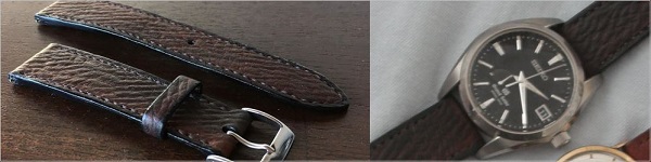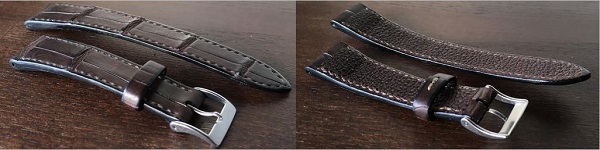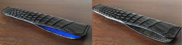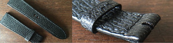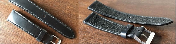 ロシアンカーフで時計ベルトを2本製作させて頂きました。まず一本目は文字盤黒、銀縁の時計。素材のロシアンは文字盤に合わせて色の濃い部分を切り出しました。贅沢に裏までロシアンを用いています。ループは定革なしで少し幅広にした遊革のみ。仕上げがしやすいのと、フィットした遊革なら機能的に足りると考えているためです。バネ棒はレバー付きで工具を使わなくても簡単にベルト交換ができてベルト自体も傷まないのがメリットです。写真右はお客様から送付いただきました。いやー、雰囲気バッチリですね。