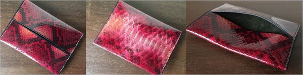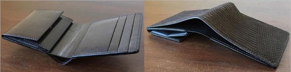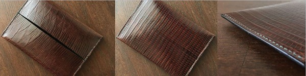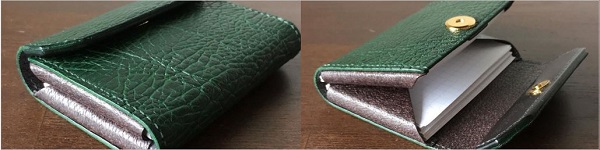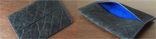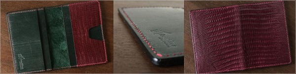 もう1点はパスケース。LIM同様にTEGU、アメ豚、スウェードの3層構造で外装はTEGU、内装は雰囲気のあるスウェードで中央を揉み込んだアメ豚により真ん中で折れ曲がる様になっています。カードケースの表はTEGUを使用しました。こちらは胴体センターから良い部分が取れたので表側にだしてあります。 自分としてもしっくりくるものが作れて良かった。ご注文と長い事お待ちくださり大変ありがとうございました。