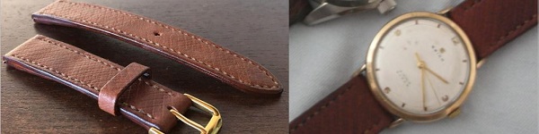 二本目は文字盤白、金縁の時計。コチラの時計には色が薄めのロシアンを使用しました。裏もロシアンを用いています。「先ほどレターパック届きましたので早速時計につけています。ピッタシジャストでございます。憧れのロシアンカーフという事でますます時計に愛着が湧きました。」楽しまれている様子が目に浮かぶようで僕もすごく嬉しいです!今回は穴無しの状態でいったん送り、マーキングをしてもらってから穴あけて送付という手順をとりました。「松山様のコーディネートセンスのおかげで腕時計を身に着けるのが以前にも増して幸せです。」 ご注文ありがとうございました。ちなみに友人のzinryu氏は時計ベルトを長持ちさせるためにレモン汁を使っているそうです(コチラ)。ベルトの裏側に塗ると良さそうですね。ご参考まで。