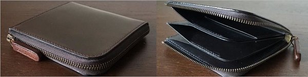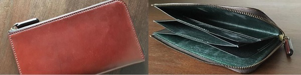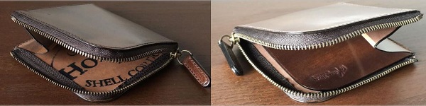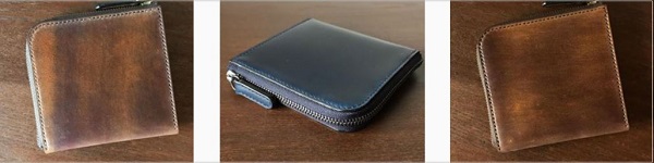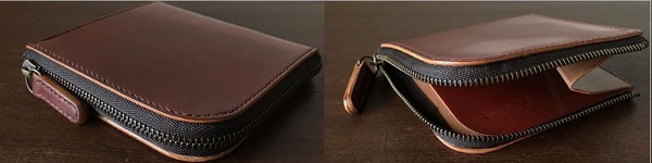 外観は普通のミニL字ファスナー財布ですが、LIZのショートバージョンとして開発したものでアコーディオンのように大きく開く構造が特徴です。今回は米国Horween社、イタリアRocado社、日本の新喜皮革、レーデルオガワなど様々なコードバンが揃っています。イタリアRocado社はコードバンタンナーとしては後発で耳慣れないかもしれませんが、自然な風合いと美しい色合いや独特の香りが魅力です。