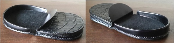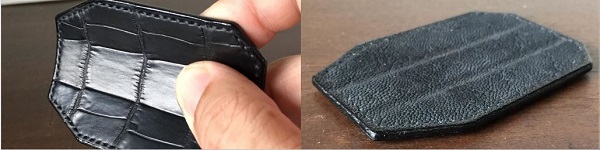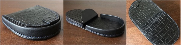 若いお客様から黒桟革で何点かご注文を頂きました。まず1点目はショート財布CLIP。外装は黒桟、内装はブライドルで札押えのみアクセントとしてクロコのセンターからとったパーツを使用しています。コインケースのボタンはマグネットなので近づけるだけで閉じるため開閉がカンタン。外装の黒桟革とアメ豚はセンターの部分のみを少し薄くして揉むことでコシを取ってから張り合わせをしてあるため180度開き、かつセンターで曲がる様になっています。格好良く紙幣をめくる動作をお楽しみください。