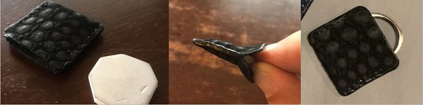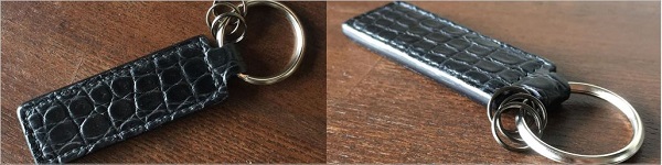 端材でキーホルダーも製作しました。クロコはアメ豚で裏張りをして、間に分厚いブライドルレザーを挟んであります。6mm程の厚みがあり力を込めて握ってもびくともしない強度があります。 あわせてお使い頂ければ幸いです。
