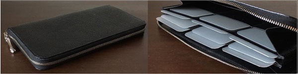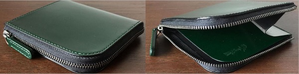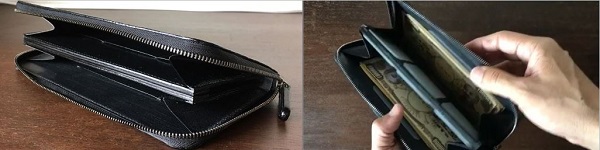 「しかも小銭入れ下部を斜めにカットしてあるから奥の隅に小銭が入り込むこともない。カードが縦入れで取り出しも入れるのも楽。手前のマチがないから札へのアクセスもしやすい。本当に良く考えられた構造!しかもジップ付き長財布とは思えないぐらい薄い」