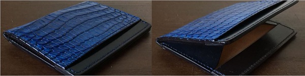 「割と勢いで注文してた部分もあったので、「どんなんかなぁ...?」とは思っていたのですが、届いた品物は純粋にカッコイイお財布でした。」紫藍クロコは藍染を繰り返して濃い藍色まで持っていった上で、さらに紫根を染め重ねて深みを与えた究極素材です。縫い目がウロコの谷間になるべくかからないようにセンターから良い部分を切り出しています。内装はイタリアROCADO社のコードバン(ネイビー)を使用した豪華バージョン。製作してみてわかったんですが紫藍クロコと色の相性が非常に良かったです。 「「藍」の色はまた独特でイイ感じですね。内装のコードバンも確かに相性バッチリでした。カッコイイお財布を作って頂き、ありがとうございました。」相性の良い素材の組み合わせの発見。またひとつ引出しが増えました。ご注文ありがとうございました。