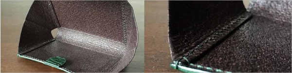 珍しくラウンドジップも製作しました。外装はたまたま見つけて気に入り購入した紫のクロコ。かなり濃い色で室内ではパッと見で黒に見えますが、光に当たると実に良い深い紫色なのです。傷がなくもっちりとした手触りで彫りも深い非常に良い個体。内装はグリーンのブライドルにしました。外は紫と黒、中は緑と黒というカラーリングです。構造的な特徴は、開くことで底が浮き上がるトレーのようなコインケースと取り出しやすい縦入れのカードスロット。中央に3列x2、両サイドはジッパーと干渉しない中央部に幅広めで2列x2。1スロットに2、3枚入れる想定です。動画はコチラの最後にあります。