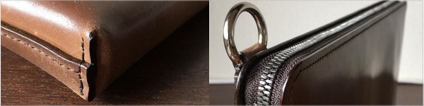 外装はHorween社シェルコードバンの#4。内装はブライドルのグリーンです。コードバンを一針ずつ引き締めながら縫うことで生まれる立体的な縫い目は総手縫いならではの美しさ。「想像を軽く通り越して、ただただ驚きです…匂いまでいいなんて。久しぶりに良い物を引き当てたぞと一人でニヤつき、気がつくと触っている次第です。どちらの商品もミニマムなのにとても使いやすいです。LIZの薄さには本当に驚きです。」シェルコードバンがお好きなお客様で他にも2点ご購入いただいたので引き続き紹介いたします。
