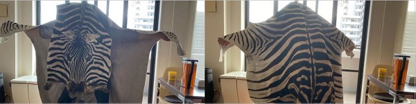 もちろん本物。とりあえず被って遊んでみたら息子には相手にされず、、、。コロナの影響もあってオーダーしてからかなり時間がかかりましたが、究極のエキゾチックレザーとも言える念願の一枚をようやく手に入れることが出来ました。脚や尻尾はもちろん顔と耳も全部ついていて丸ごと一頭だからとにかくデカい。そして値段もなかなかにヘビーです。毛付きの革は初めて購入したんだけど、思ったよりも毛足が短めで割と普通に仕立てられそうな気がするのでまずは小さい目のアイテムを作ってみようかと思っています。脚や首周りは模様が細かいので小物系に、胴体は豪快にバッグなどで使いたいですね。やったことないので仕立てられるかわからないけども。