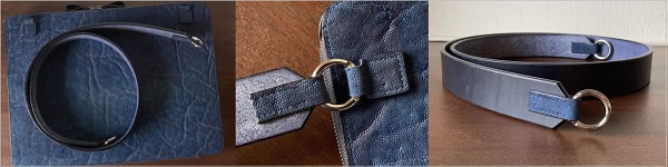 自転車に乗るということでベルトを取り付けてショルダーバッグとして使えるようにしてあります。接続はリングナスカンでベルトの脱着はとてもカンタン。ベルト本体は分厚いブライドルレザーの一枚革で、両端にエレファントのループをつけてあります。革のあるあるなんですが、ネイビーということで買ったこのブライドルのベルト。届いてみたらなんだか紫っぽい、、。表だけ染料を足して色を落ち着かせました。