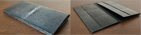久しぶりに製作したガルーシャ製品。数十枚の革の束の中からスターマークが特に美しい個体を選び抜きました。結構個体差があるんですよね。アイテムは長財布のDIX。カード入れは使いやすさを優先した右向きで、札入れは出し入れしやすい様に上部を開いてあります。動画はコチラ。部材同士の重なりを最小限におさえてあるので中身を入れてもあまり膨らみません。「実物の方が格段にカッコ良いですね♪色味も写真より黒よりでイメージどおりです。中身を入れてみたのですが、空になった元財布よりも薄くてビックリしました。」縫製用の溝を掘らずに総手縫いをしてあるためガルーシャの質感を全面に生かし切った仕立てが特徴です。もう一品製作したので引き続きご紹介します。
