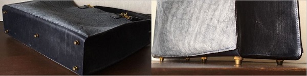 胴板と底面はフラットに縫い合わせてあります。大きな革の真ん中の長い距離を縫い進めていくのでとても大変。ですがバッグの内部はすっきりと広く使えるし革に負担がかからず、芯材を入れて底鋲を打つことで底面が地べたに着かないので気兼ねなく床に置けます。電車で座った時に両足の間に床置き出来ると中身を取り出しやすくてかなり楽なんですよね。