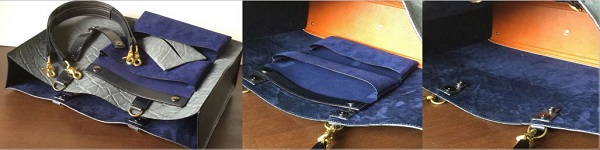 このトートバッグの最大の特徴は本体、ハンドル、内装の接続仕様を決めてパーツごとに製作するモジュール設計。作る立場からすると製作効率が良く、使う立場からはハンドルをショートに付け替えたり内装を付け替えたりとフレキシブルな利便性を実現するものです。「このカバンとは展示会以来2回目のご対面ですが相変わらずインパクトが凄くカッコいいですね。あの展示会で見た時から一目で気に入ってしまい、オーダーしてしまいました。いつも素敵な商品を有り難う御座います。」実は僕のトートを見て同じ仕様でご注文くださいました。他にもトートバッグ(ブログ2018-06-11)や財布、ノートカバーなどもお使いのお客様。こちらこそいつもありがとうございます。ちなみにバッグ内装底面を明るい色にしてあるのは中を見やすくするためです。