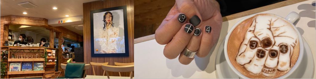 原宿竹下通りを抜けてちょっと入ったところにあるラテアートカフェReissueさん。久しぶりにジョージさん(Twitterはコチラ フォロワーなんと36万人!)に会いに行ってきました。コロナの影響で席数は減っていましたがお店は盛況。ひっきりなしにお客さんが来ては、入れないので折り返し連絡をもらうというスタイルで僕もしばらく散歩してからやっと入店。塗りたての爪をラテアートにしてもらいました。